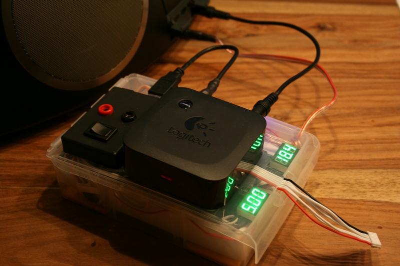 An einem der USB Stecker betreibe ich einen schnurlosen Musikadapter für Bluetooth Audiogeräte von Logitech, der normalerweise über ein externes 5V Netzteil betrieben wird. So kann ich drahtlos Musik vom Handy/Tablet auf den Lautsprecher übertragen.